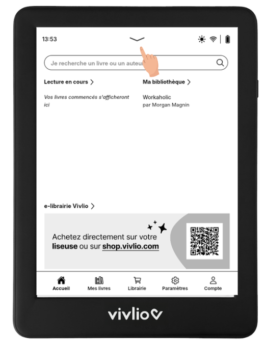 - Débranchez la liseuse et retrouvez votre e-book dans la Bibliothèque