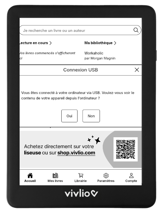- Sur la liseuse apparaîtra la fenêtre "Connexion USB", cliquez sur "OUI"