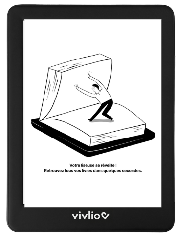 Lors du démarrage de la liseuse, un visuel de l’appareil s’affiche à l’écran, accompagné de la mention "Votre liseuse se réveille".