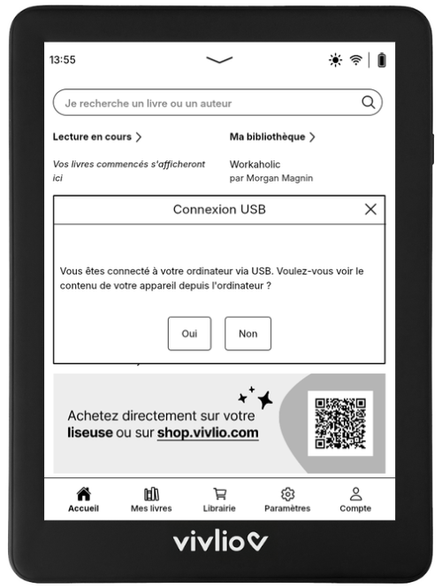 Un message de "Connexion USB" doit apparaître sur l'écran de la liseuse, une fois branchée au PC. Vous devez valider la connexion en appuyant sur "Oui" pour que la liseuse apparaisse sur votre ordinateur.