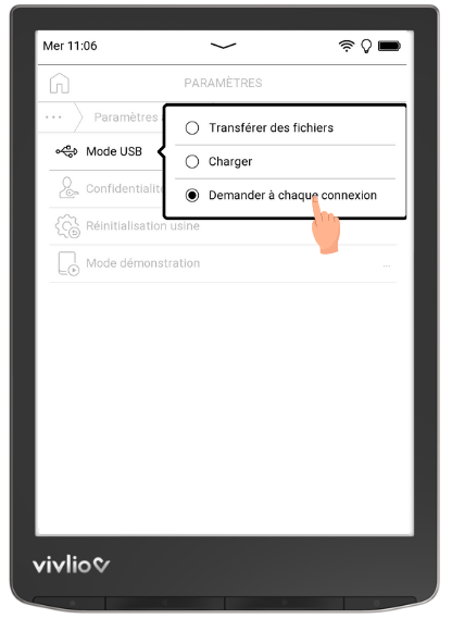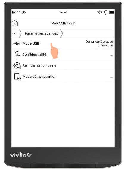 Pour autoriser la liseuse à afficher ses fichiers sur ordinateur et pour en transférer de nouveaux, configurez votre liseuse de la façon suivante :